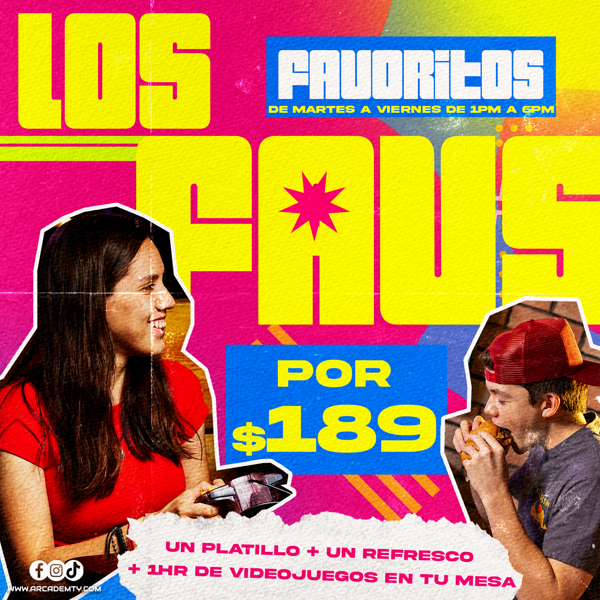 Elige una de nuestros 4 platillos favoritos (Tacos philadelphia de arrachera, Alitas 10pz, Buffalo sandwich o hamburguesa Sunset riders) + refresco en lata y una hora de videojuegos en la mesa por solo $189 pesos mxn.