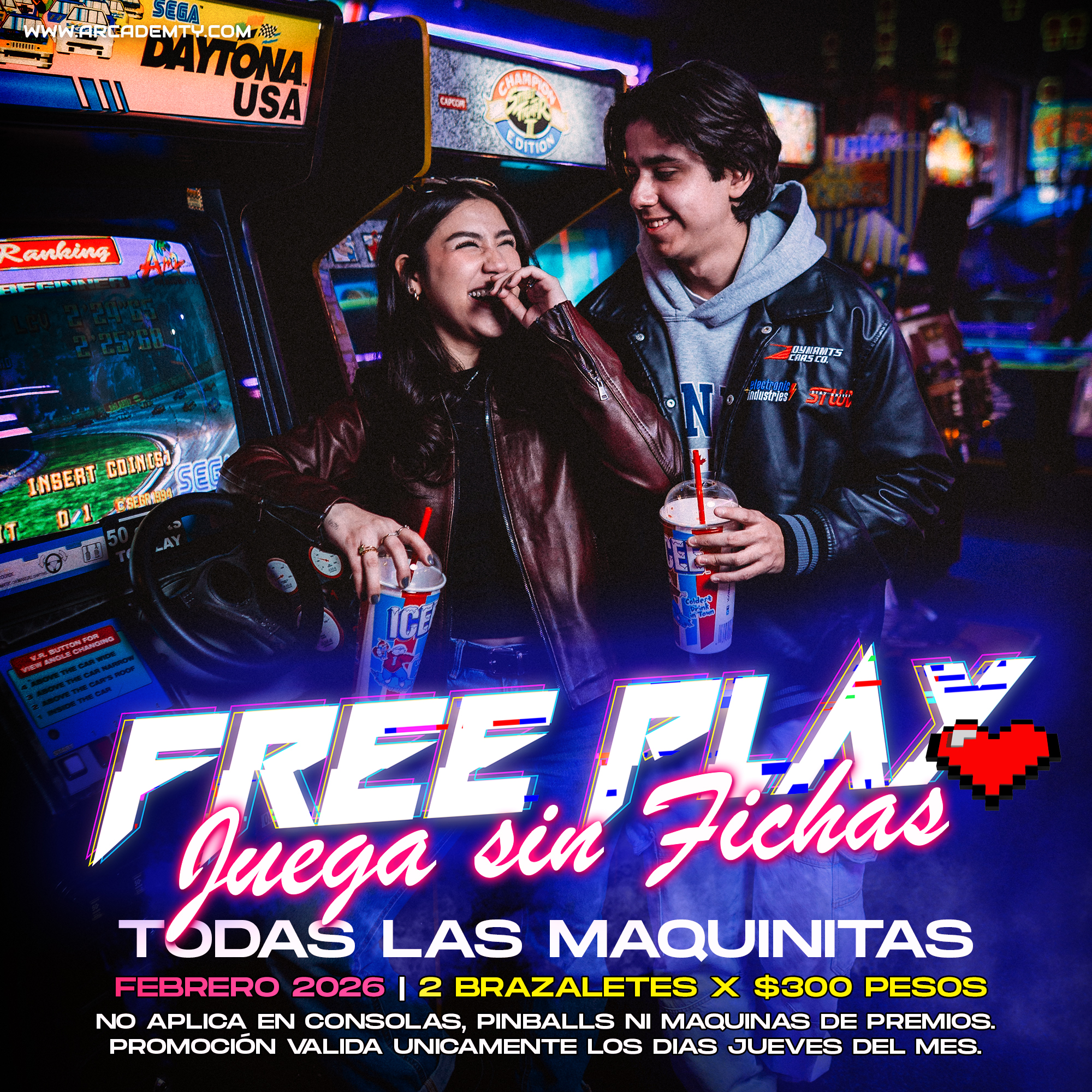 Juega en todas las maquinitas en el segundo piso sin fichas con un único pago. Costo 2 X $300 pesos mxn por persona. incluye dos pulseras que en todo momento deben permanecer visibles. Precio sujeto a cambio sin previo aviso. Costo general para niños y adultos. No incluye tiempo de espera en restaurante. No incluye máquinas de premios.